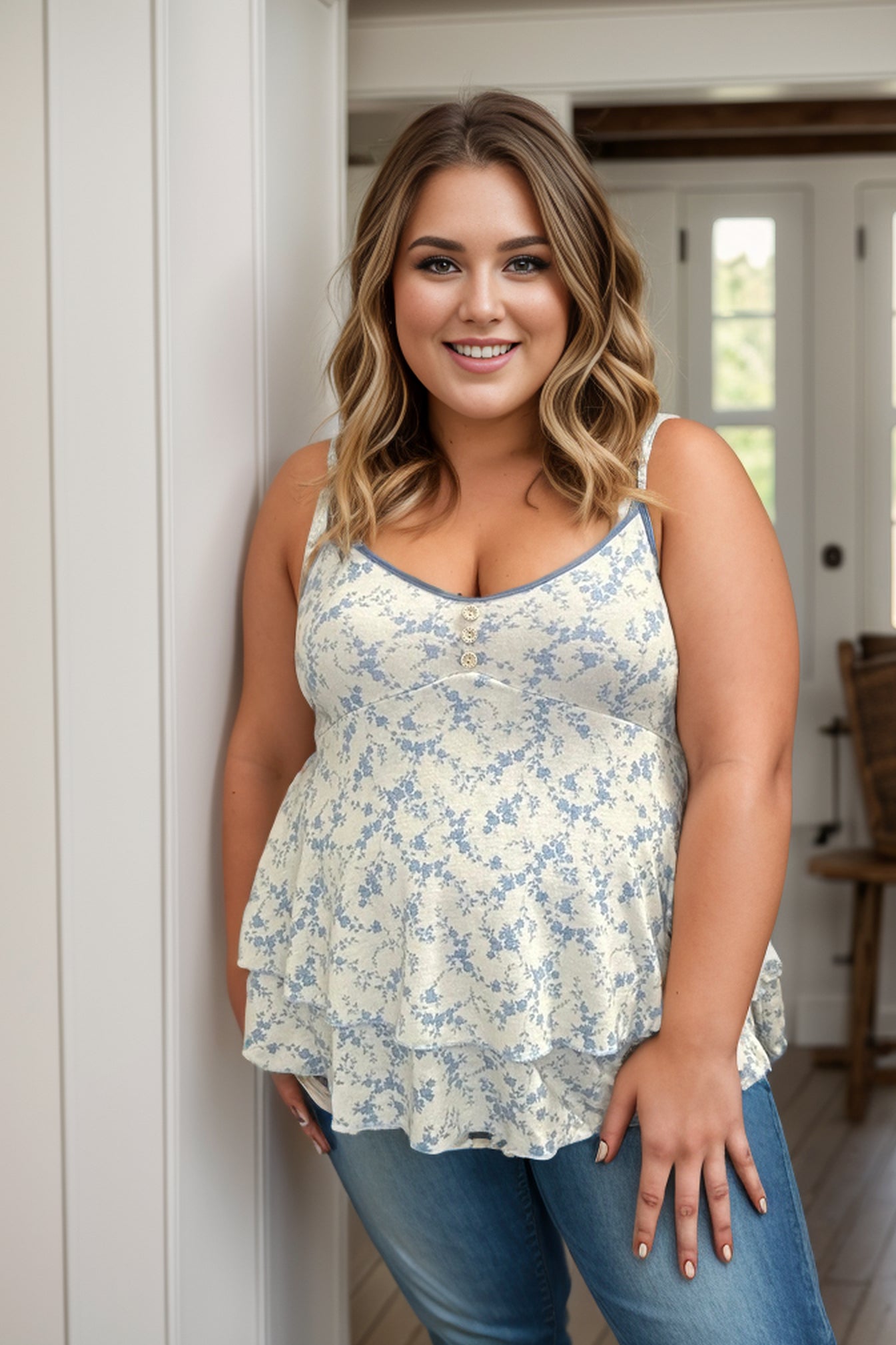 Wrap yourself in comfort with this double ruffle hem tank. With v-neck and spaghetti straps, you'll feel light and breezy. The cute button detail and baby blue trim with a white floral print make this top as sweet as a lullaby.