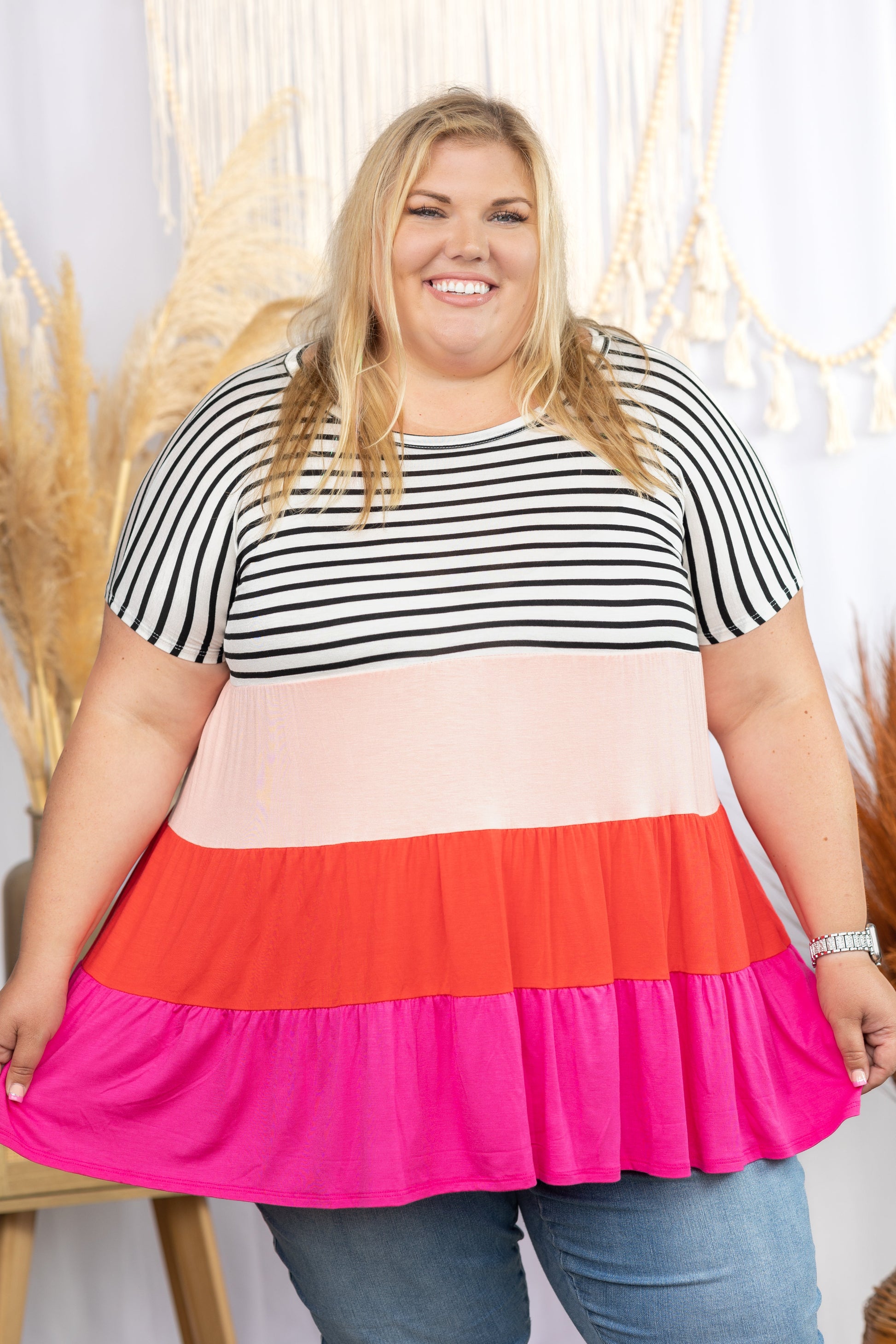 Show your love of fashion with our Tiered Love Tunic! Featuring a eye-catching colorblock design and a dreamy tiered ruffled hem, this top is sure to turn heads! Comfortably stylish with its round neckline and short dolman sleeves, this top is ready to take your wardrobe to the next level!